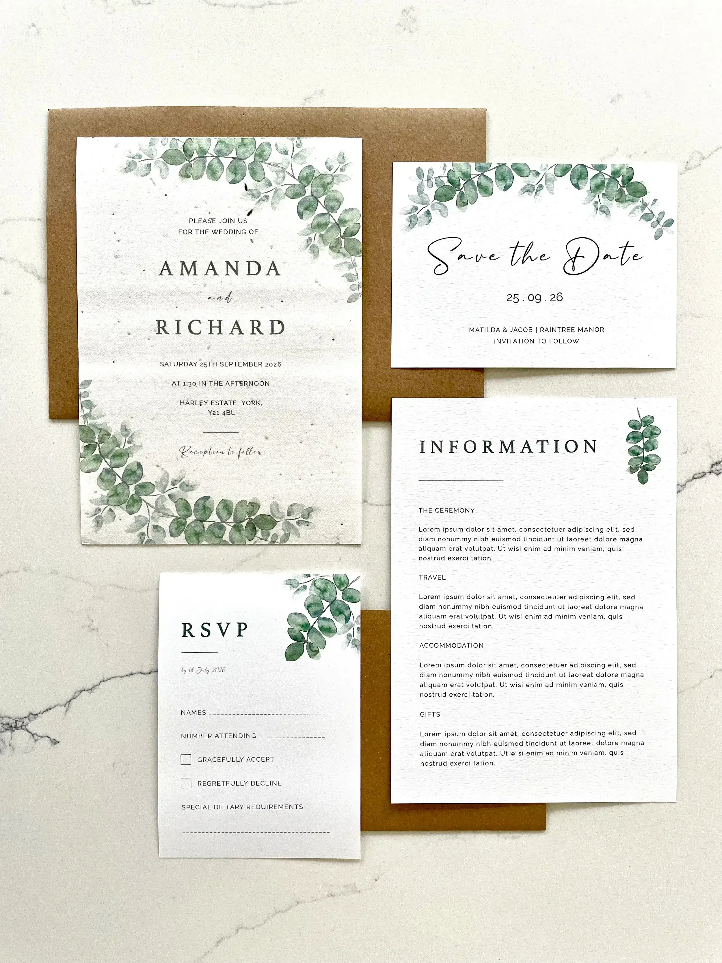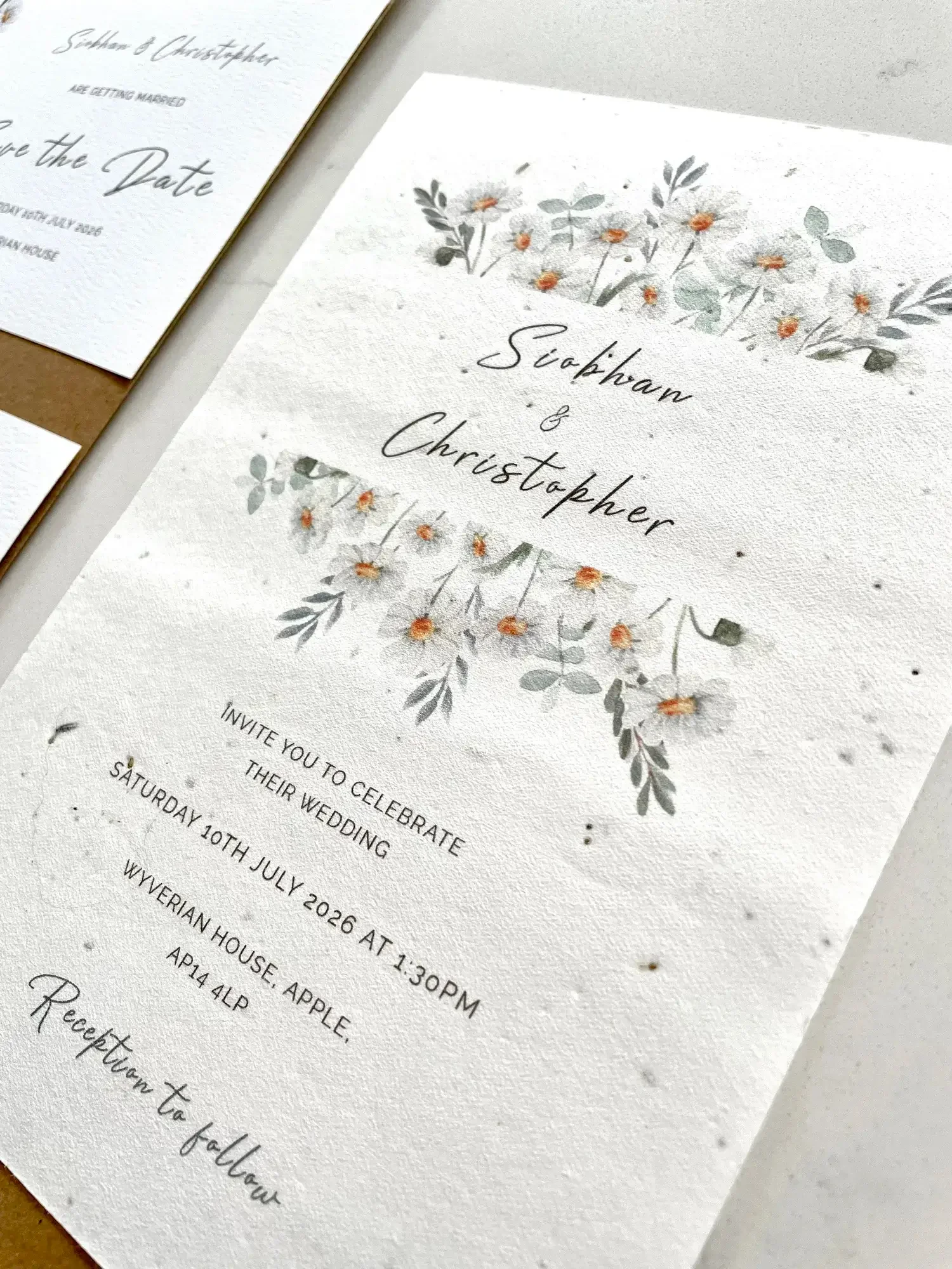 Poppy and Thistle offers a range of collections for you to choose from. Some simple and elegant, others with more intricate details. The invitations are printed on plantable wildflower seed paper - friendly for the environment, the bees and the butterflies. All of our collections are designed to be friendly to the eye, while the papers are friendly to the environment.